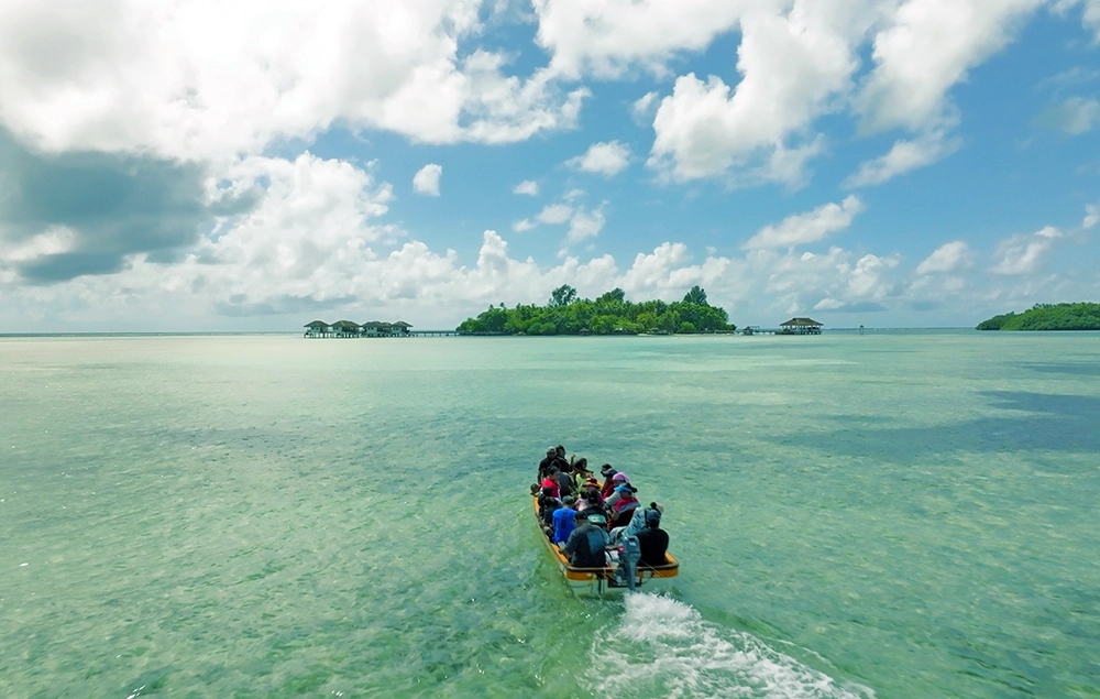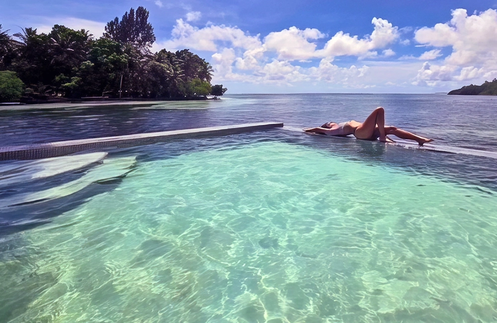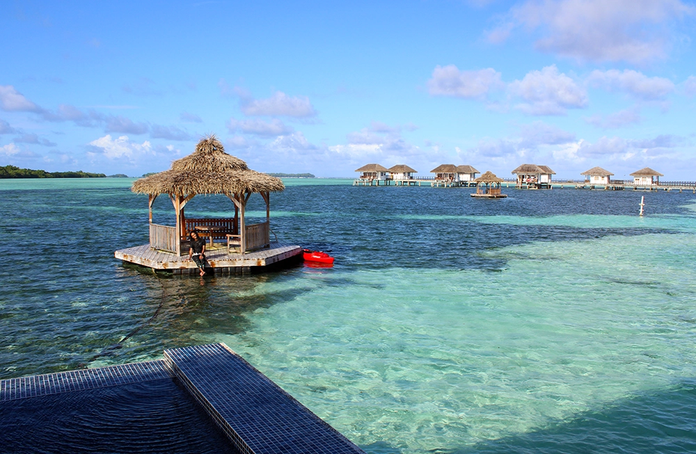 Check-in is located in the centre of the island a short distance from the elevated walkways, over-water bungalows and restaurant pavilion. There are also two floating cabanas and a three-person water swing, a popular 'selfie' attraction, located in the lagoon waters around the resort structures. There are good cell and Wi-Fi service throughout the resort.
